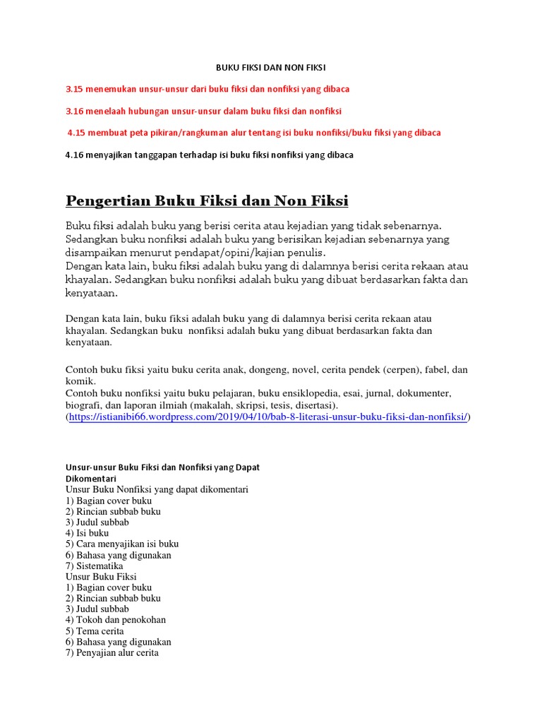 Istilah fiksi diartikan sebagai suatu karya yang mudah dibuat dan sifatnya tidak terlalu terikat berbagai aturan layaknya karya ilmiah. Buku fiksi adalah buku yang berisi cerita atau kejadian yang tidak sebenarnya. Ruangbelajarlc Soal bahasa indonesia kelas VIII semester genap materi tentang unsur buku fiksi dan non fiksi.
