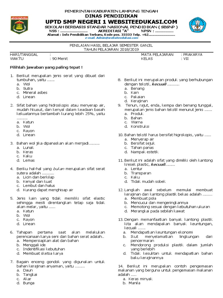 Soal Pas Prakarya Kelas 7 K13 Sem 1 Ganjil Soal Pelajaran